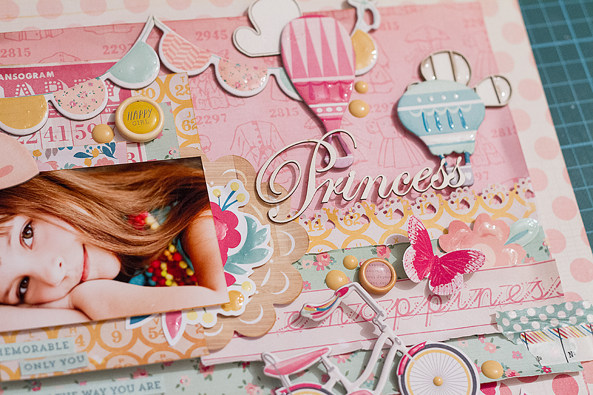 Такие детали как: облака, трава, домики и тд задают пространственное восприятие декора. облака- значит небо и уже самолетики и воздушные шары не будут смотреться так одиноко на нашей страничке. Немного травы и цветов -и велосипед уже едет не по бумаге- а по полянке. Добавляйте тематические штучки, чтобы декор находился в своем сюжете.